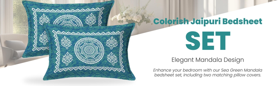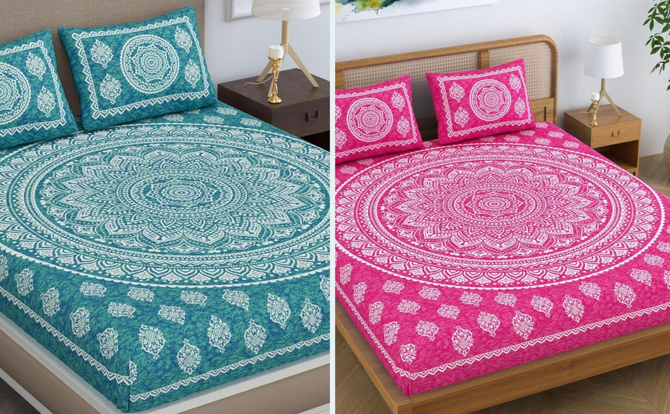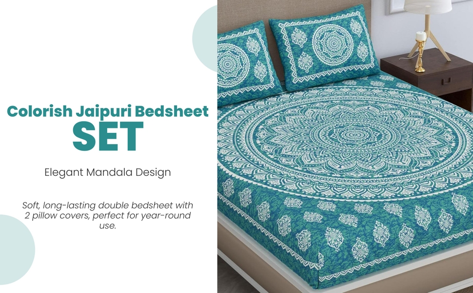 Colorish 120 TC Cotton Blend Mandala Printed Jaipuri Bedsheet for Double Bed King Size with 2 Pillow Covers